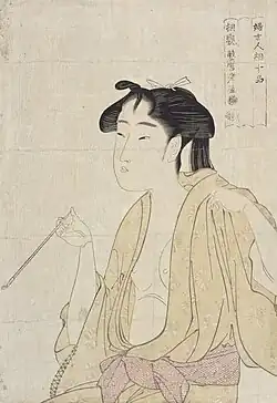 In Tabako no Kemuri o Fuku Onna (煙草の煙を吹く女, "Woman blowing tobacco smoke"), Utamaro depicts a young woman holding a kiseru tobacco pipe. She sits in a decadent posture with her kimono open, exposing her breasts, and her hair is coming untied. The pipe rests on her fourth and fifth fingers, with her thumb at the end on her index and middle finger holding it on top. She blows a puff of smoke rendered with karasuri embossing against the mica-dusted background.[12]