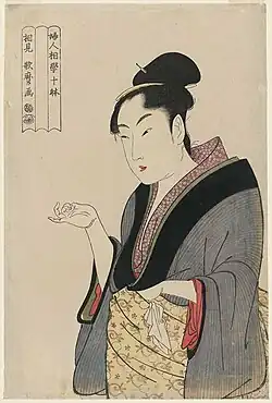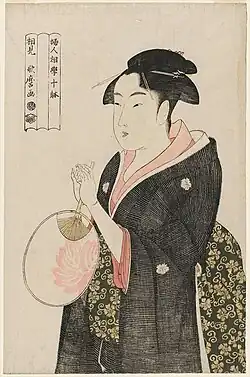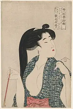 It is assumed the words 相見 and 相観 are read sōmi and that they refer to a person who reads physionomies, thus the signature can translate as.[8] This has to do with Sōgaku, a pseudoscience by which it was believed an analysis of facial features ("physignomy") could reveal personality traits. Texts were published at the time on these analyses. Utamaro's analyses were not based on these observations, but rather on allusions to other books, such as the illustrated story by Santō Kyōden of a prostitute disguised as a dancer, and an erotic book illustrated by Utamaro and Katsukawa Shunchō called Ehon Hime Hajime (会本妃女始, "Picture Book: First-Time Princesses", 1790), in which facial types are compared to the aspects of the sexual organs. Viewers likely were aware of the allusions of the prints to these books.[9]