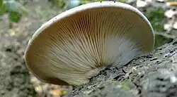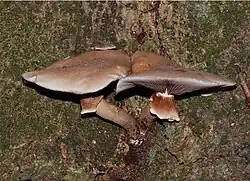 Another edible native fungus is the brown oyster mushroom, part of the genus Pleurotus, which are favoured for eating as they are less slimy when cooked.[24] This fungus grows mainly on manuka (Leptospermum scoparium) and native bush but can be found growing in the roots of trees either solitary or in clusters.[25] These can be found in Australia, New Zealand, and Malaysia.[25] Their general distribution is in the North Island of New Zealand, but there have been sightings of them in the upper South Island.[4]