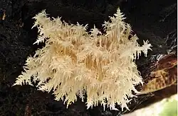 Hericium novae-zealandiae, Pekepeke-kiore in Māori, or fungus icicles more commonly, can grow between 5–25 cm in diameter.[4] They are found in the autumn months of the Southern Hemisphere (March–July) and were harvested by Indigenous Māori as a food source.[4] This fungus is a decomposer, breaking own dead wood to provide energy to create its unique fruiting bodies on rotting trees. This mushroom has been experimented on both in cuisine and medicine with potential antibacterial properties.[13]