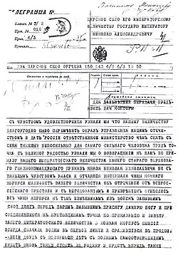 Keller's telegram addressed to the abdicated Nicholas II, March 6, 1917.