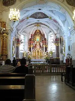 The monastery buildings, at the top of the hill, are Baroque; the church was rebuilt in 1665 and the other buildings, which form a quadrangle on its south side, date to 1733–49.[6][30] The main object of veneration by the pilgrims is a statue of St. Anne with the Virgin and Child carved out of lime wood above the main altar in the church, about 66 centimetres (26 in) tall, which supposedly contains relics of the saint from the monastery of Ville near Lyons in France and is credited with miracles. It is said to have been donated to the church by Nikolaus von Kochtitzky, a local nobleman, in 1560, and is dressed in cloth of gold with pearls.[9][12][23]