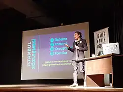 Kav, a feminist activist, is the general representative of We Will Stop Femicide Platform.[5] In 2014 she was elected to the Executive Board of the United June Movement.[6] Kav has appeared in multiple media outlets discussing the problem of violence against women in Turkey.[7][8] She is a writer and columnist, who has been published by organisations such as: Yarın Haber;[9] Yeni Yaşam.[10]