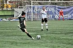 Güzide Alçu (left) performing an indirect free kick against Beşiktaş J.K. in the 2017–18 First League season.