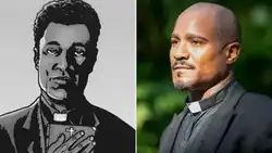 Gabriel Stokes, as he appears in the comic book series (left) and as portrayed by Seth Gilliam in the television series (right).