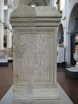 Later he was promoted to the Senate by the Emperor Septimius Severus, his brother-in-law.[2] Having entered the Senate with the rank of Praetor in 194,[3] Alexianus was made Legatus in the Legio IV Flavia Felix[4] and later served as governor of Raetia,[2] which may be dated to 196/197.[3] During his proconsulship of Raetia, he dedicated an altar to the Emesene God Elagabalus.[4] The altar and its inscription, still intact, mentions him as a priest of the deified Emperor Titus.[3]