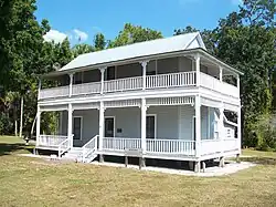 In 1895, the postbellum owner, George Patten's youngest son Dudley Patten, built a wooden, two-story vernacular Victorian style house for his young family. (Patten's wife, Ada Melville Turner Patten is said to have demanded a modern home after the couple who were married in 1891, had been living for several years in the old mansion with Patten's widowed mother.) The state has restored the Patten House, which is also part of the plantation park complex.[8] But, in 2014, termite and water damage proved to cause concern for visitor's safety, so the house was closed to the public. Talk of demolition caused community members to stand for renovation, which was approved and begun in 2016. By December 2017, the contractors realized damage was more extensive than once believed, and asked the State of Florida for more money. The decision was made, once more, to demolish the home.[9] Fortunately, the community outcry once more appears to have saved the home from this permanent solution to a temporary problem.[10] The Patten House was nominated and has been selected as one of Florida's 11 to Save for 2018 by the Florida Trust for Historic Preservation. The announcement was made on May 17, 2018. The 11 to Save program is designed to increase the public's awareness of the urgent need to save Florida's historic resources, and to empower local preservationists and preservation groups in their efforts to preserve Florida's history.[11]