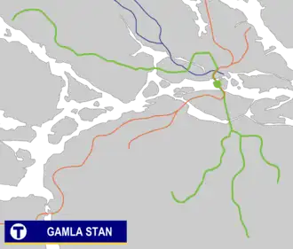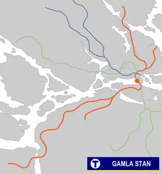 Gamla stan is a station on the Green and Red lines of the Stockholm metro. It is located on the western side of the Gamla Stan (Old town) district of central Stockholm, and is at ground level, although partly under the Centralbron bridge that carries road and mainline rail across the waterways that define the centre of the city. The same waterways are responsible for the ground level location of the station, unusual for a city centre metro station, as the lines cross between the islands of Stadsholmen and Södermalm by a bridge immediately south of the station.[2][3]
