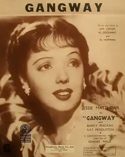 Gangway is a 1937 British musical film directed by Sonnie Hale and starring Jessie Matthews, Barry MacKay, Nat Pendleton and Alastair Sim.[1] Its plot involves a young reporter who goes undercover to unmask a gang of criminals who are planning a jewel heist. AKA as Sparkles in Australia and on Australian release 78rpm records.[2] Jessie Matthews was nicknamed SPARKLE in the film.[3][4]