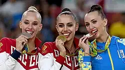Ganna Serhiivna Rizatdinova[nb 1] (Ukrainian: Ганна Сергіївна Різатдінова; born 16 July 1993) is a Ukrainian individual rhythmic gymnast.[8][9] In the all-around event, she is the 2016 Olympic bronze medalist, a two-time World All-around medalist (silver in 2013, bronze in 2014), and a two-time (2014, 2016) European All-around bronze medalist.