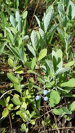 Gaylussacia nana is a shrub up to 1 m (40 inches) tall, sometimes forming large colonies of hundreds of individuals. It has dull green to yellow-green leaves up to 4 cm (1.6 inches) long. Inflorescences hang from the leaf axils or from the tips of branches, with 1-4 greenish-white flowers. Fruits are sweet and juicy, usually dark blue but sometimes white, up to 8 mm (0.3 inches) in diameter.[5][6]