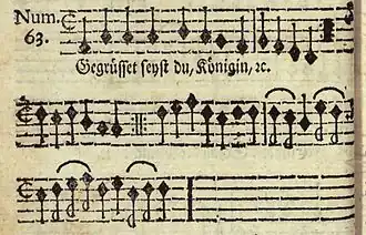 A different melody appeared first in a 1736 hymnal from Hildesheim, Geistliche Spiel- und Weckuhr. It was taken by emigrants to the U.S., with an English text, Hail, Holy Queen, enthroned above,[3] which first appeared in The Roman Missal in 1884.[4] This version became popular after it was featured in the 1992 film Sister Act.[1]