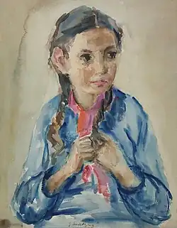 Gela and her husband Izrael were forced to move into the Warsaw Ghetto probably in 1940. Just before the ghetto was sealed off in that year, Gela gave birth to her daughter, Margalit. Gela and Izrael were both active in the ghetto in charity organizations. Gela held drawing classes in the ghetto, and mounted small exhibits of her students' works. She probably participated in making the costumes for a children's show entitled "The Seasons" in 1942. She was awarded a prize, for her work with children, by the Judenrat chairman Adam Czerniaków.[3] Gela continued to paint during her ghetto years, drawing portraits such as children in the soup kitchen, her daughter, her husband, and her friends writers. Gela, together with Izrael, actively participated in the Oneg Shabbat enterprise, headed by Dr. Emmanuel Ringelblum, which dealt with secretly documenting Jewish life within the ghetto. In July 1942 German deportations from the ghetto started. Knowing that the end is near, Gela prepared her works for hiding in the secret archive. In the early days of August, Izrael Lichtenstejn her spouse, and two of his students, Dawid Graber and Nachum Grzywacz, hid Gela's paintings, together with other documents, in the archive boxes that he buried in a school cellar on Nowolipki Str. The exact date of Gela's death is unknown, but it is believed she died during the Warsaw Ghetto Uprising.[1][2]