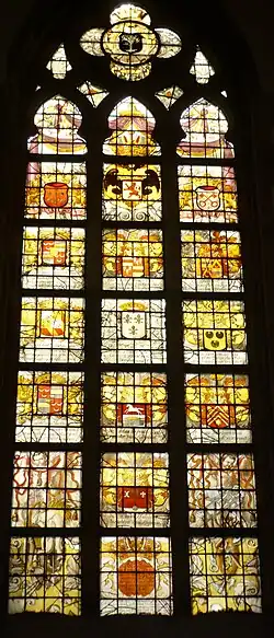 Heraldic shields of the Hoogheemraadschap van Rijnland members in 1691, the year that this church window was donated by the Water Board to the church in Lisse, currently located in the St. Bavochurch.