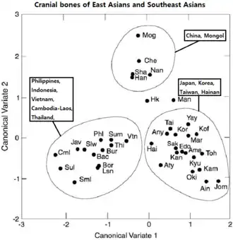 The modern Japanese cluster is said to be the most similar with the Korean one; in a haplotype-based study, the Japanese cluster was found to share 87–94% of its genetic components with the Korean cluster, compared with a Han Chinese result of only 0–8%, a distinct contrast. Moreover, the genetic affinity to the Korean cluster was particularly strong among a cluster hailing from Shimane specifically and Honshu more broadly, but relatively less pronounced, albeit still overwhelming, in the Kyushu clusters. In any case, however, the study clarifies that "the estimate of ancestry profile cannot provide the definitive history of original migration, unless it will be further verified against historical evidence."[8] Some studies suggest a genetic connection between Koreans and Southeast Asian populations. A 2017 study by Ulsan University analyzed a 7,700-year-old skull in Korea, finding evidence of genetic links to ancient populations, including those from Southeast Asia, such as Vietnamese people. This research highlights the complex migration patterns in East Asia’s prehistory.[24] Similarly, Japanese research conducted in 1999 proposed that the Yayoi people, an ancient population contributing to modern Japanese ancestry, may have migrated from the Yangtze River basin in southern China. This was supported by DNA analyses showing similarities between Yayoi remains in southwestern Japan and early Han Dynasty remains from China’s Jiangsu Province.[25] However, other studies suggest that modern Koreans share closer genetic ties with Central Asian and Northern East Asian populations. A mitochondrial DNA analysis revealed a genetic affinity between Koreans and Mongolians, indicating a shared Central Asian ancestry. Additionally, genetic research suggests that while Koreans share some common ancestry with other East Asian populations, their genetic ties with the Chinese are relatively more distant.[26] Genome-wide studies further demonstrate that Koreans are genetically closest to Yamato Japanese and Manchu populations, reflecting shared ancestry and historical interactions, while genetic connections between Koreans and Southeast Asians are more limited.[27][28]