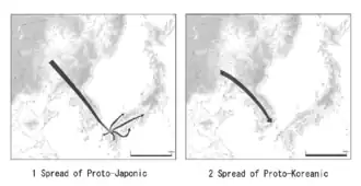 According to Alexander Vovin, the Yayoi were present in the central and southern parts of Korea before they were displaced and assimilated by arriving proto-Koreans.[47][48] A similar view was raised by Whitman (2012), further noting that the Yayoi are not closely related to the proto-Koreanic speakers and that Koreanic arrived later from Manchuria to Korea at around 300 BC and coexisted with the Japonic speakers. Both had influence on each other and a later founder effect diminished the internal variety of both language families.[49]