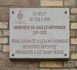 Commemorative plaque at the home of Geneviève de Gaulle, 10 Rue de Robin, Rennes