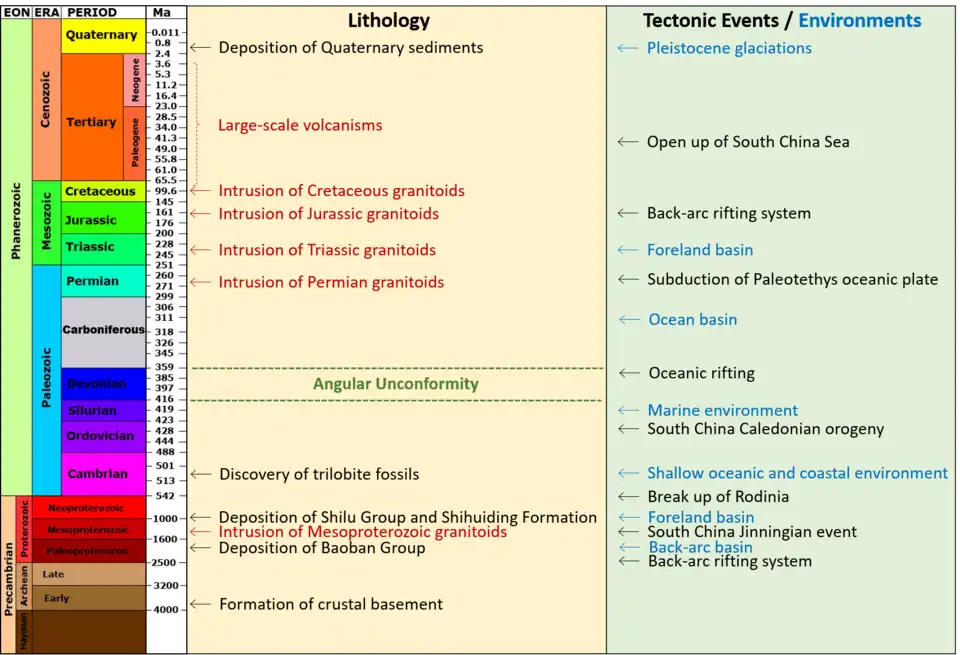 Continuous rock records were found from Ordovician to Silurian Periods. Silurian rocks were mainly composed of interlayers of tuffaceous rocks and fine-grained clastic rocks formed in marine environment.[10] The rocks were metamorphosed in which some showed phyllitic characteristics.[10]