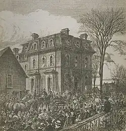 A gathering held outside George Brown's House during his funeral, 1880.