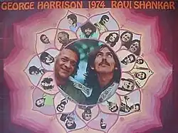 Among Shankar's orchestra of top Indian classical musicians were Alla Rakha, Shivkumar Sharma, Lakshmi Shankar, Hariprasad Chaurasia, L. Subramaniam and Sultan Khan.[21] All of Shankar's musicians had recently participated in his Music Festival from India tour of Europe,[22] which Harrison presented under the auspices of his Material World Charitable Foundation. Harrison also recorded a studio album by Shankar's orchestra and helped promote his other Dark Horse Records act, Splinter. These commitments left him behind schedule with his own album, Dark Horse, which he was forced to complete in Los Angeles in October, when not rehearsing for the tour.[23][24] During the concerts in North America, the two ensembles performed separately and as one,[1][25] mirroring the East–West fusion of Shankar's first Dark Horse album, Shankar Family & Friends.[26]