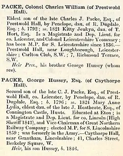 George Hussey Packe biographical note in The county families of the United Kingdom; or, Royal manual of the titled and untitled aristocracy of Great Britain and Ireland, 1860