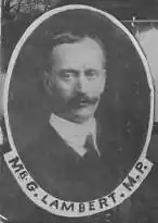 He was first elected as Liberal MP for South Molton at a by-election in 1891. He was Civil Lord of the Admiralty, 1905–1915, "a post for which he had no obvious qualifications. 'A farmer sent to sea' was a jibe frequently heard in those days" (The Times).[4] He lost his seat at the 1924 General Election to the Conservative Cedric Drewe, but regained it at the 1929 general election. Although he began his parliamentary career as a Liberal, in 1931 Lambert had become a National Liberal supporting the Conservative Party, following a long period criticising David Lloyd George and opposition to the Labour Party.