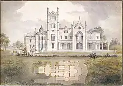 In 1864 Merritt bought Knoll, the former country estate of William S. Paulding, Jr. and hired architect Alexander Jackson Davis to expand the estate, doubling the house's size in the gothic revival style between 1864 and 1865, renaming it "Lyndenhurst" for the estate's linden trees.[13] His new north wing added an imposing four-story tower, new porte-cochere (the old one was reworked as a glass walled vestibule) and a new dining room, two bedrooms, and servants quarters. After his death, his widow, Julia sold the Irvington house to financier Jay Gould.[14]
