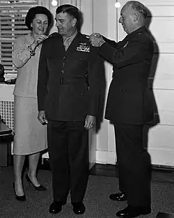 He then served as assistant operations officer of aircraft, Fleet Marine Force, Pacific under Major General James T. Moore until June 1945, when he was finally ordered to the combat area as operations officer on the staff of Commander, Naval Air Base, Okinawa. Bowman participated in the administering of shore controlled air-sea rescue facilities and was decorated with Bronze Star Medal with Combat "V" for his service.[3][1][2][4]