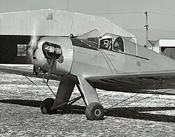 The first incarnation of Les Long's low wing design was built in 1937 by Les and Swede Ralston.[9] It used an Aeronca "L head" (E-107) engine.[3] It became known as Wimpy. The airplane was ultimately owned by Myron "Buzz" Buzzwell.[10] Bogardus and others improved upon the design, e.g. they added a Continental A40, and a NACA 23012 airfoil. A second airframe was built by Tom Story and Lee Eyerly, at Eyerly Aircraft,[11] about 1940. It was purchased by Bogardus in 1945 and it came to be known as Little Gee Bee. In 1947 Bogardus and A&P mechanic Cliff Krum installed an additional fuel tank and a Continental A65 for the flights to Washington D.C.[11] Fred Sheppard furnished a fuel filler neck and the gas cap from Tex Rankin's wrecked Republic Seabee. Little Gee Bee was based at Bernard's Airfield in Beaverton, Oregon.