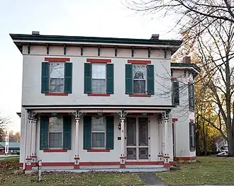 The George and Margaret Cooper House is a historic building located in Mount Pleasant, Iowa, United States. It is a fine example of the Italianate style, which was a popular style for residential architecture in Mount Pleasant from the 1850s to the mid-1880s[2] The two-story brick house features an asymmetrical plan, a low-pitched hip roof, wide bracketed eaves, and long, narrow windows. The full-width front porch has square paneled columns with foliate designs in the capitals and brackets. A single-story wing is attached to the rear of the house. A two-story, five sided wing was added to the west side of the house about ten years after the main part of the house was built. The house was built for George Cooper, a taylor, and it remained in his family until 1921. It was listed on the National Register of Historic Places in 1997.[1]
