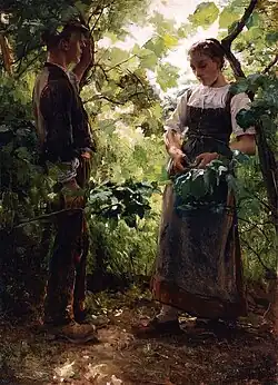 During the 1890s Laugée's success continued. One of his 1891 Salon entries, Au printemps de la vie (In the Springtime of Life), which won a medal, was chosen for exhibition at the World's Columbian Exposition in Chicago in 1893, forming part of the French art shown there (see image right side). The painting clearly shows the melding of Impressionism with the intensity of the Pre-Raphaelites, not unlike what was done by other painters around the same time, such as John William Waterhouse (1849-1917) and Arthur Hughes (1832-1915, see his April Love[8]). William Walton's guide to the art and architecture in the Exposition discusses Laugée's painting and observes its naturalist authenticity: "More of these humble folk, artfully arranged but with very little artificial glossing over of their awkward rusticity, may be seen in George (sic) Laugée's "In the Spring-time of Life", a very upright and much embarrassed pair facing each other in a pleasantly illuminated bit of greenery. Bastien-Lepage was one of the first to render this subtle charm of the tender passion burning sweetly through an uncouth exterior, like the flame of a horn lantern, as it were." In 1900, at the Éxposition Universelle in Paris, this painting received another medal, this time a silver medal.