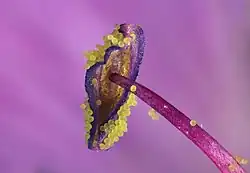 Its bloom period is April to September, depending on elevation and latitude. It has saucer-shaped, pink-to-purple flowers[4] measuring 1.5 inches (3.8 cm) with reddish-purple lines on the petals. They occur in an open cluster near the top of strong, branching and leafy flower stalks,[4] which are 1–2 feet (0.30–0.61 m) tall.