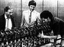 One of SSI's first grants funded the development of the mass driver, a device first proposed by O'Neill in 1974.[47][48] Mass drivers are based on the coilgun design, adapted to accelerate a non-magnetic object.[49] One application O'Neill proposed for mass drivers was to throw baseball-sized chunks of ore mined from the surface of the Moon into space.[50][51] Once in space, the ore could be used as raw material for building space colonies and solar power satellites. He took a sabbatical from Princeton to work on mass drivers at MIT. There he served as the Hunsaker Visiting Professor of Aerospace during the 1976–77 academic year.[52] At MIT, he, Henry H. Kolm, and a group of student volunteers built their first mass driver prototype.[32][43][47] The eight-foot (2.5 m) long prototype could apply 33 g (320 m/s2) of acceleration to an object inserted into it.[32][43][50] With financial assistance from SSI, later prototypes improved this to 1,800 g (18,000 m/s2), enough acceleration that a mass driver only 520 feet (160 m) long could launch material off the surface of the Moon.[43]