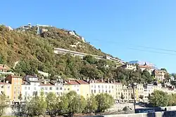 The Bastille at Grenoble on the Chartreuse mountain range, with at the centre the former university buildings of the Rabot and the student residence of the same name.