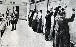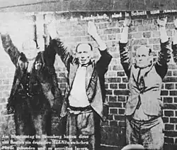 On September 9, the first public execution took place in the Old Market Square in Bydgoszcz, where 20 people were killed.[23][25] The Poles gathered in the square before the execution were beaten with rifle butts, forced to fall and rise, and stand for hours with their hands raised.[26][27] When a German soldier was shot on the night of September 9 to 10, Braemer ordered that the next day, another 20 hostages be shot in the Bydgoszcz market square. On September 10, five other civilians were shot in the square – allegedly while attempting to escape.[23] It was not uncommon for local Volksdeutsche to pass among the rows of detained Poles and Jews, pointing out supposed participants of the Bydgoszcz "Bloody Sunday" to the escort. These people were then separated from the rest of the prisoners, marked with a cross sign using white paint, and shot.[28][29] In this way, among others, 20 Poles detained on Saperów Street perished.[30]