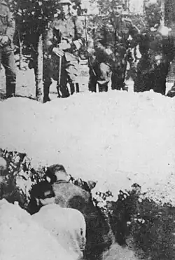 In the first few days after the Germans occupied the city, chaos prevailed in Bydgoszcz. Concurrently with taking control of various districts of Bydgoszcz, the occupiers carried out mass arrests of civilians. The victims were primarily workers, railway employees, small craftsmen, lower-ranking officials, and high school students – as members of the Civic Guard mainly came from these social groups.[18] In the ad hoc executions carried out by Einsatzgruppe IV and the Wehrmacht (especially soldiers from the 1st Signal Regiment), hundreds of residents of the city were killed. General Walter Braemer estimated that between September 5 and 8, at least 400 people were shot in Bydgoszcz. Meanwhile, Werner Kampe calculated the number of killed residents of the city during this time to be between 200 and 300 people.[19] The first executions were quite spontaneous and chaotic. Polish civilians were shot at various locations in the city during this time: in the barracks of the 16th Greater Poland Uhlan Regiment on Szubińska Street, in the barracks of the 15th Greater Poland Light Artillery Regiment on Gdańska Street, at the city stadium on Mościckiego Avenue (now Sportowa Street), at the airport on Jagiellońska Street, near the wall of the prison on Wały Jagiellońskie Street, and in the vicinity of the municipal hospital on Bielawki.[16] The brutality of the Germans was fueled by the belief that Bydgoszcz was engulfed in a "Polish uprising". This was evidenced by the occasional shots fired by "partisans" in the city.[20] However, it is difficult to assess how many times German soldiers were actually attacked by Poles and how many times these incidents were simply the result of uncontrolled gunfire, caused by inexperienced and "partisan psychosis"-ridden German recruits.