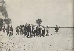 During the night of 4–5 September, near Serock, soldiers of the German 604th Road Construction Battalion unexpectedly opened fire on a crowd of POWs from the Pomeranian Army. In the ensuing chaos, between 69 and 84 Polish soldiers and interned civilians were killed.[79][80] On 6 September, near the village of Moryca, the Germans executed 19 officers of the 76th Infantry Regiment. Additionally, a number of enlisted soldiers from this regiment were burned alive in Moryca and the nearby Longinówka.[81] On 8 September, near Ciepielów, soldiers of the German 29th Infantry Division carried out several executions of prisoners of war. It is generally accepted that this most notorious crime of the September Campaign claimed around 300 Polish soldiers (primarily from the 74th Infantry Regiment), though the actual number of victims was likely lower.[81] On 10 September, in the courtyard of a church in Piaseczno, 15 prisoners of war were executed[82] (some sources claim the number was 21).[81] On 12 September, in the building of a public school in Szczucin, Wehrmacht soldiers burned alive or shot at least 40 Polish POWs. In the same massacre, around 30 civilian refugees and 25 local Jews were also murdered.[83] During the night of 13–14 September, in the barracks square in Zambrów, German guards opened fire on Polish POWs after a stampede was triggered by frightened horses. Around 200 POWs were killed in the chaos, and another 100 were wounded.[84] On 18 September, near Śladów by the Vistula river, the Germans massacred captured soldiers of the Poznań and Pomeranian armies, as well as civilians – local residents and refugees.[85] According to Szymon Datner's research, the estimated number of victims was around 300,[84] though the actual figure may have been lower.[81] On 20 September, in retaliation for the alleged mutilation of a German soldier by Poles, 42 POWs were executed in Majdan Wielki.[86] On 22 September, in a barn in the village of Urych, Wehrmacht soldiers burned alive between 73 and 100 POWs – soldiers of the 4th Podhale Rifles Regiment.[87][88] On the same day, in Boryszew near Sochaczew, 50 soldiers from the Bydgoszcz National Defense Battalion were executed in retaliation for their supposed involvement in the killings of Volksdeutsche during Bydgoszcz's so-called Bloody Sunday events.[89][90] On 26 September, during an assault on Warsaw's Ochota district, the Germans – according to eyewitness accounts – used Polish POWs as "human shields", forcing them to march in front of their tanks. Many POWs perished in the crossfire.[91] On 28 September, in Zakroczym, SS troops from the Panzer Division Kempf, despite an ongoing ceasefire, unexpectedly attacked defenders of the Modlin Fortress as they prepared to surrender. According to estimates, several hundred Polish soldiers and about 100 civilians were killed.[92][93] Executions of Polish POWs also took place in Mszczonów (8 September, 11 victims) and Stare Kozłowice (12 September, 5 victims).[81]