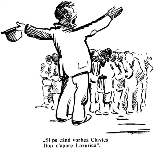 Late that month, Opinia newspaper alleged that "Lăzurică, that famous chief of the Romanies", had been escorted to the 21st Police Precinct after failing to settle a bill with a saloon on Dealul Spirii.[141] Boangiu writes that, as the conflict between the two Voivodes was turning bitter, both figures engaged in "obvious manipulation" of the truth.[142] In the wake of the death hoax, Lăzurică and his followers announced that they would take up the offensive against "certain left-wing newspapers", since these had denied the Romanies' "assimilation into the Romanian element". To signal their visibility and commitment to "integral nationalism", they staged a rally in Iepurești, with speeches by Lăzurică, Șerboianu, Zima, Gheorghe Bașud, Ghiță Slobozeanu, and other community representatives.[143]