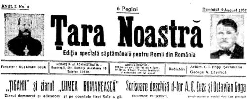 Calinic Șerboianu (left) and Lăzăreanu-Lăzurică on the nameplate of Țara Noastră's weekly Romani issue (edition of August 1, 1937)