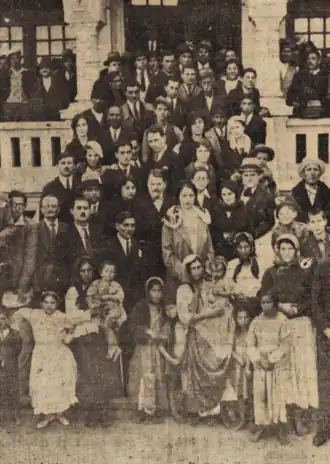 Scholar Mihaela Mudure notes that voivodal references in the 1930s were meant to evoke a "romanticized version of Gypsy leadership" and command "feudal" loyalty from UGRR members; "democratic practices", she argues, "were very limited."[48] While the 28-member executive committee worked pro-bono, Lăzurică, as the UGRR acting president, received unconditional refunding for all his expenses.[31] Lăzurică surrounded himself with distinguished members of the community: violinist Grigoraș Dinicu assisted him as honorary chairman, though he had initially resisted his own appointment;[35] historian George Potra and musician D. Panaitescu were members of the UGRR committee.[26] Lăzurică extended an offer to the incumbent Bulibașa, who was living "somewhere in Bessarabia", and could not be found in time for the selection.[35] The Voivode also increased grassroots representation, being the first Romani leader to encourage the participation of women, who formed their own corps within the UGRR.[49] Lăzurică now claimed to be leader over 1 million Romanies, which was probably double the number of Romanies existing in Greater Romania.[50]
