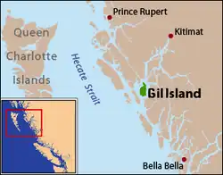 Gil Island is an island on the North Coast of British Columbia, Canada, located on the west side of Whale Channel in the entrance to Douglas Channel, one of the main coastal inlets, on the route of the Inside Passage between Pitt Island and Princess Royal Island. It is 26 km (16 mi) long, with a width ranging from 6 to 13 km (3.7 to 8.1 mi), and an area of 231 km2 (89 sq mi). The only named summit on the mountainous island is Mount Gil, which faces the opening of Douglas Channel.[1]