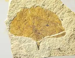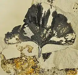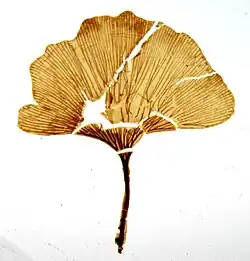 Ginkgo leaves were borne on both long and short shoots on lateral branches of the main stem. They are recognized by their distinctive leaf shape and open dichotomous venation pattern. Ginkogoales are spermatophytes, belong to the lignophyte clade, and are euphyllophytes.[1]
