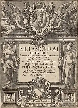 • Le Metamorfosi di Ovidio, ridotte in Ottava Rima. The first three books of the poem appeared at Paris, 1554, 4to., and again at Venice, 1555, 4to. The whole work was first published at Venice in 1561, 4to., and was then dedicated to King Charles IX of France, as the previous part had been to Henry II. Subsequent Venetian editions, belonging to the sixteenth century, all of them having annotations by Giuseppe Orologi, are those of 1563, 4to., 1575, 4to., 1578, 4to., 1579, 8vo., 1581, 4to., with engravings, and those of 1584, 4to., and 1592, 4to., two handsome impressions by the Venetian Giunti, with engravings by Giacomo Franco. Six other editions are enumerated as having appeared in the course of the seventeenth century.