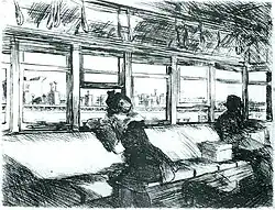 During the early 1920s his etchings began to receive public recognition. They expressed some of his later themes, as in Night on the El Train (couples in silence), Evening Wind (solitary female), and The Catboat (simple nautical scene).[43] Two notable oil paintings of this time were New York Interior (1921) and New York Restaurant (1922).[44] He also painted two of his many "window" paintings to come: Girl at Sewing Machine and Moonlight Interior, both of which show a figure (clothed or nude) near a window of an apartment viewed as gazing out or from the point of view from the outside looking in.[45]