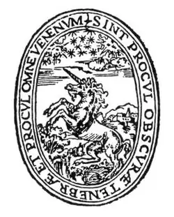 The printer's device of Girolama Cartolari is an oval-shaped image with a unicorn in the center and with sun, moon, stars, and landscape printed in the background. A motto in Latin is inscribed on the border of this device: Sint procul obscurae tenebrae et procul omne venenum (let darkness and all poison be far away). The dimensions are 7.2 cm x 9.2 cm. Identification codes in the Italian registry for this printer's device are U729 and CNCM 2193.[15]