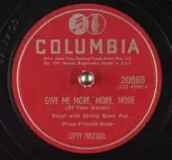 "Give Me More, More, More (Of Your Kisses)" is a song written by Walter Price, Lefty Frizzell, and Jim Beck, sung by Frizzell, and released on the Columbia label (catalog no. 20885). In December 1952, it peaked at No. 1 on Billboard's country and western jockey and juke box charts.[1] It spent 21 weeks on the charts and was also ranked No. 6 on Billboard's 1952 year-end country and western juke box chart and No. 10 on the year-end best seller chart.[2]