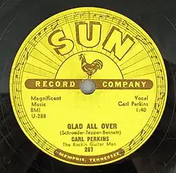"Glad All Over" is a 1957 song recorded by rock and roll and rockabilly artist Carl Perkins, "The Rockin' Guitar Man", at Sun Records in 1957.[1] It was released as a 45 and 78 single, Sun 287, on January 6, 1958 (b/w "Lend Me Your Comb").[2] It was written by Aaron Schroeder, Sid Tepper, and Roy Bennett. It is not the same song as the single "Glad All Over" released in 1963 by The Dave Clark Five.