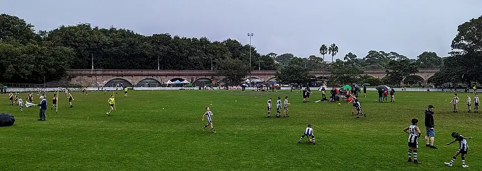 Jubilee Park viaduct is a 28-span brick arch viaduct built on a curve extending from the east of Jubilee Park at Victoria Road to The Crescent, Annandale. The viaduct contains more than two million bricks from the former State Brickworks at Homebush Bay. The bricks are laid in English bond pattern with soldier courses defining the archways. The arches are evenly spaced, being 28 x 10.06-metre (33.0 ft) clear spans. The viaduct stretches approximately 446.5 metres (1,465 ft), making it the largest brick viaduct in the NSW rail system.[1]
