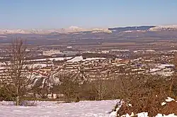 In the braes, is found the Robertson Country Park. The park is an upland area covering approximately 480 acres. It is mainly moorland but there is some woodland areas and hill farming areas. There is also woodland walk paths, streams and waterfalls, picnic areas, birdwatching sites and play equipment for children. Views of Paisley and the lower Clyde Valley to Ben Lomond are offered from the park, including from Robertson car park.[1] The area is situated on the edge of the Clyde plateau lavas; a feature is Gleniffer gorge situated along the Tannahill walkway. It reaches approximately 50 feet deep in places and is eroded by the Gleniffer burn. Another feature is the Craigielinn waterfall in Glen park, where icicles are sometimes seen hanging in winter.[2]