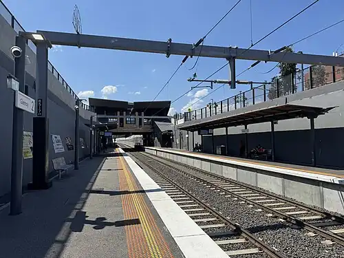 The station was rebuilt for a second time by the Level Crossing Removal Project, due to the grade separation of the Glenroy Road level crossing.[19] The level crossing was removed by lowering the railway line underneath Glenroy Road.[20] Major construction began in late 2020 soon after and, on 6 May 2022, the rebuilt station opened.[6]